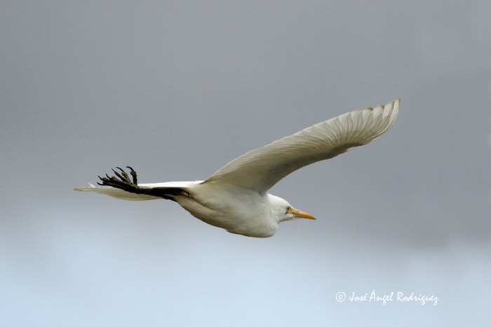 Garcilla bueyera (Bubulcus ibis) sobrevolando el paraje del Humedal del Baíco.