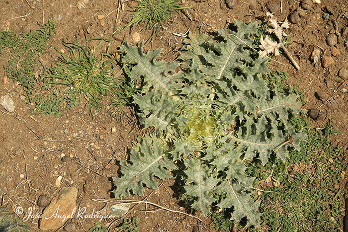 Por el color blanco de sus inflorescencias, que aparecen avanzada la primavera, también es conocida como cardo blanco sentado.