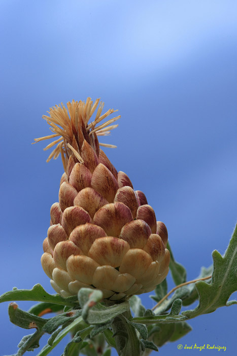 La planta cuenta con una vistosa y solitaria flor compuesta, rodeada de membranas secas, de cuyo extremo superior arrancan unos pelos largos y de color blanquecino o amarillento.