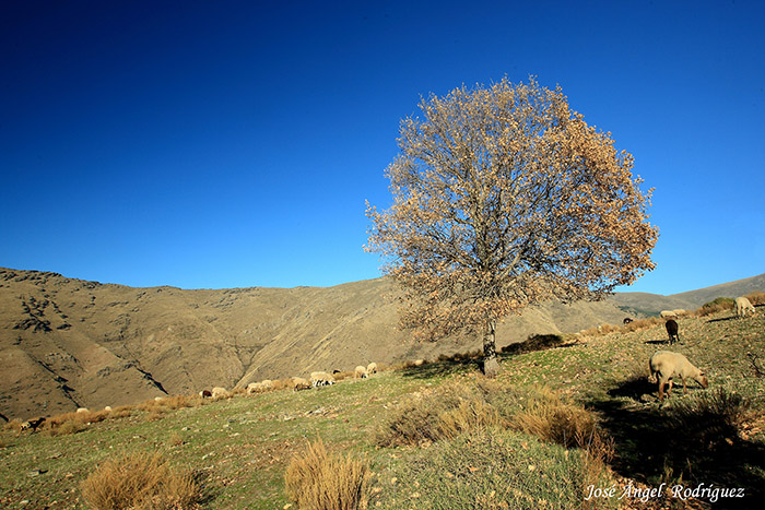 Ovejas pastando al pie de un árbol, al que se le están desprendiendo las hojas.