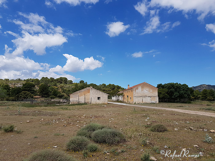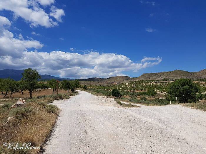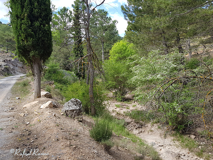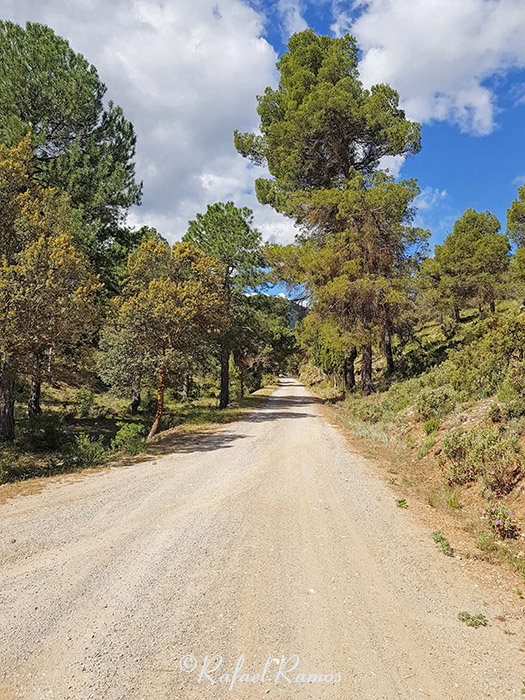 Girando a la derecha se coge la Rambla del Chopo, y en el siguiente cruce metros después, tomar a la izquierda y a partir de ese momento toda la subida era por la rambla enlazando por la izquierda en fuerte pendiente con la pista forestal ancha y con buen piso que no dejamos, encontrando a nuestro paso varias bifurcaciones a ambos lados y cortijos.