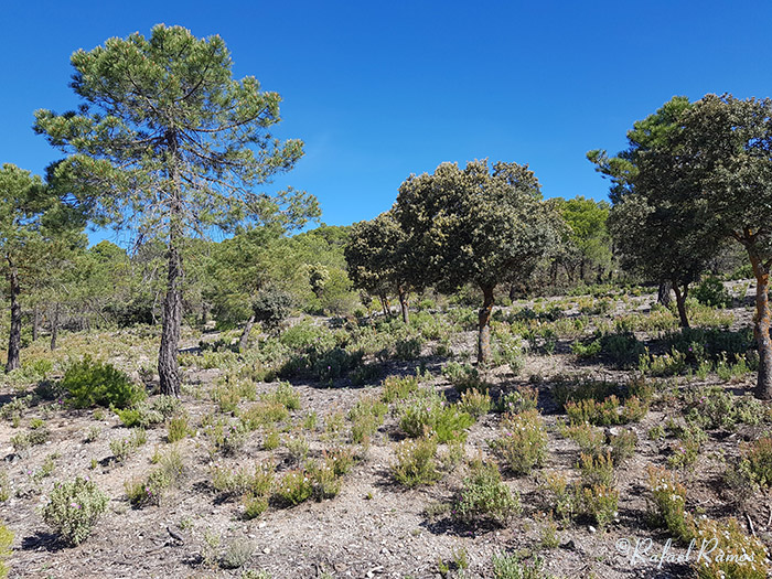Son pinares de repoblación, que desplazaron a los encinares antes predominantes, donde no es fácil apreciar la deforestación y degradación habida especialmente en los últimos 75 años, con la destrucción de una importante masa vegetal, como consecuencia de la tala de árboles para leña y para el aprovechamiento de la ganadería, sobre todo.