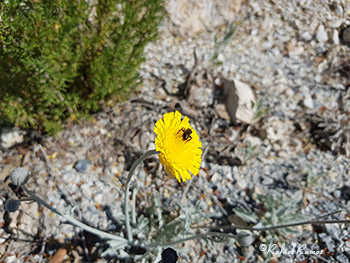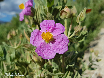 La floración del sotobosque es muy abundante en toda la zona. Esta flor frágil, que se asemeja al papel, de color morado, y que identifico como una jara estepa, también llamada jara de hoja blanca (Cistus albidus), ha sido elegida por las abejas que la visitan durante escasos 15 días cada primavera, para llevarse impregnadas en sus alas un tesoro que consumen en Europa, desde las colmenas donde han depositado el polen en la Sierra de Baza.