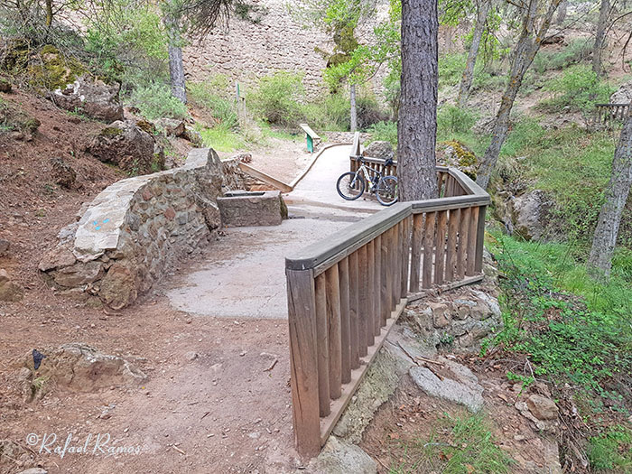 Solo faltan dos centenares de metros más hasta llegar a la Fuente de la Taza y su maravilloso entorno, después de pasar por un corto puente de piedra, donde se muestra la fuente con una mirada hacia abajo en su izquierda.
