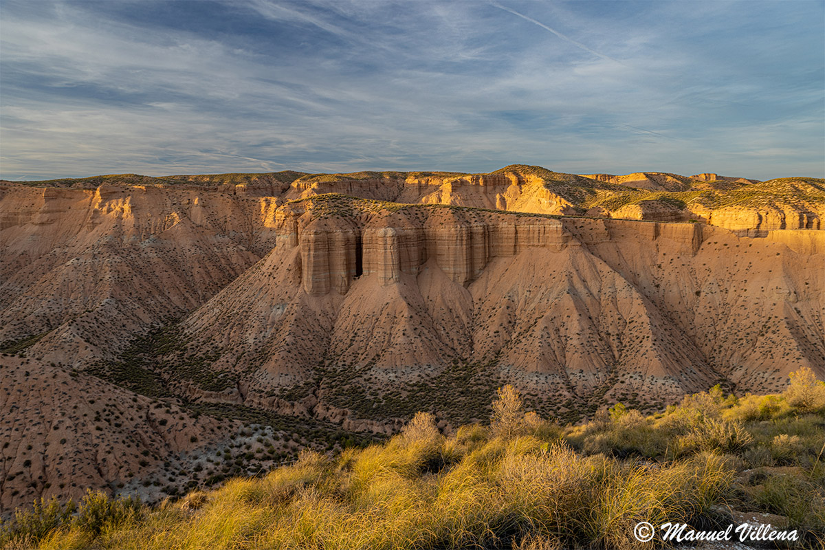El atardecer ofrece en estos valles tonalidades cambiantes en los colores de las arcillas, que cubrieron toda la zona durante el Plioceno, aportadas por los múltiples arroyos cercanos. La intensa erosión posterior ha dejado numerosos escarpes que lentamente van colapsando, produciendo acumulaciones en las partes bajas. Es un paisaje singular de tonos ocráceos, aderezado con el verde del esparto, que intenta ascender ladera arriba sin apenas conseguirlo.
