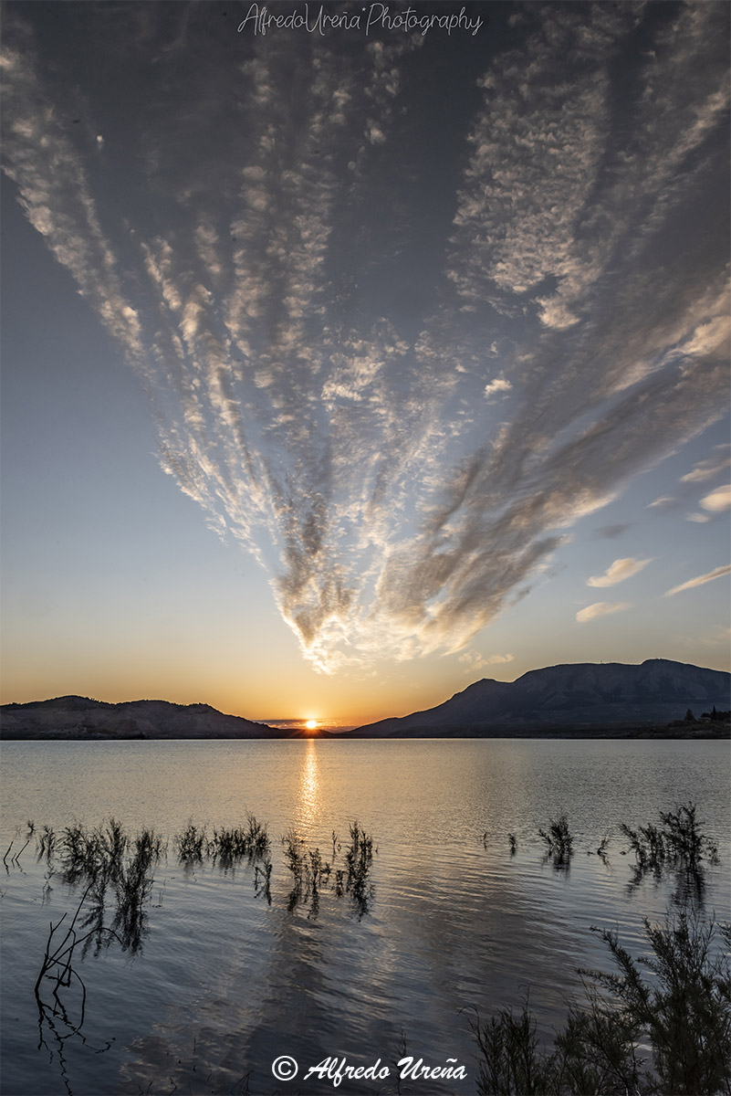 La salida del sol por la cola del embalse del Negratín, iluminaba unas nubes de formas caprichosas que parecen converger sobre el propio sol. Al fondo, a la derecha, el imponente Cerro Jabalcón en un amanecer tan espectacular como irrepetible.