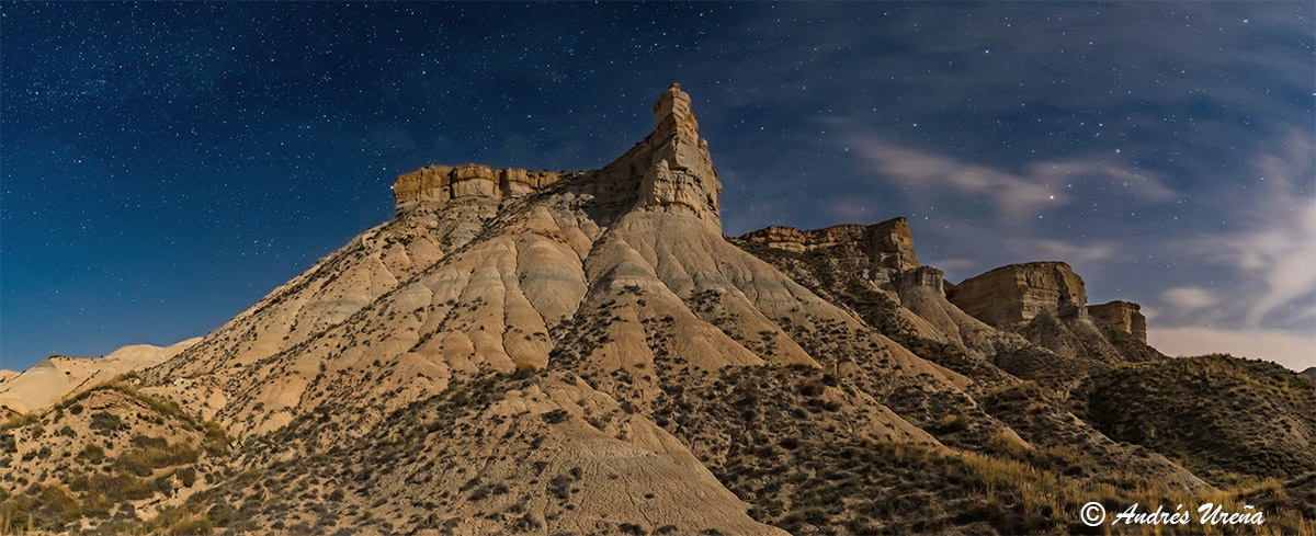 Durante la noche se acrecienta aún más el misterio que rodea esta atractiva zona del Geoparque. La luz de luna, casi llena en cuarto creciente, nos ilumina el paisaje y nos permite observar detalles de estos colosos calizos del Plioceno. Disponer de luz de luna siempre es un aliciente para poder fotografiar correctamente estas rocas de tonos blancos y ocres que reflejan la luz, permitiendo la utilización de sensibilidades en los equipos fotográficos relativamente bajas.