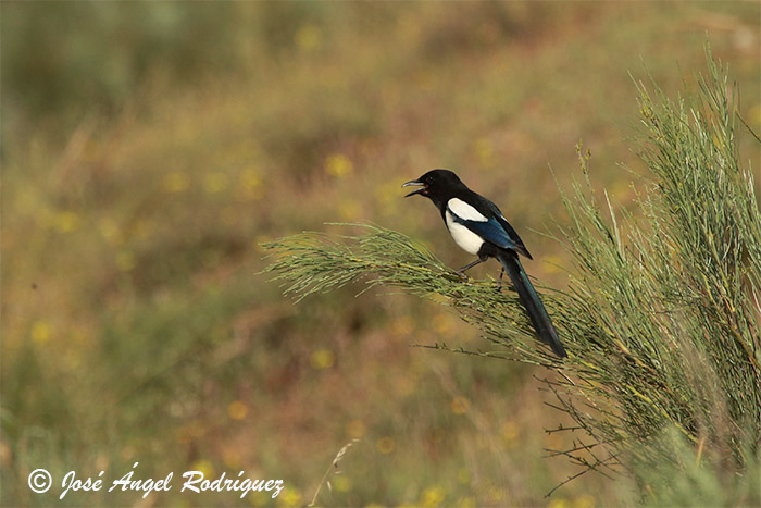 Urraca cantando desde su posadero en una retama.