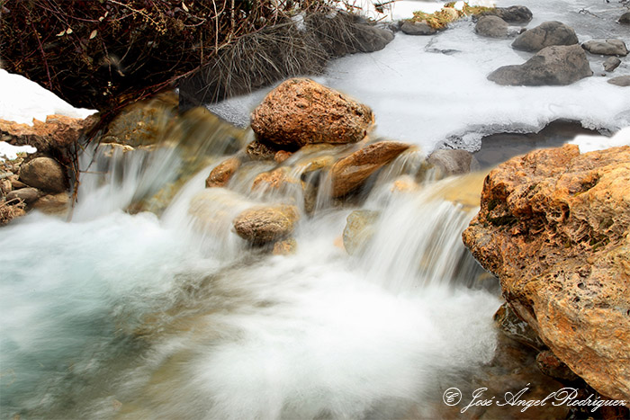 Agua corriendo entre la nieve y hielo en el arroyo del Baúl.