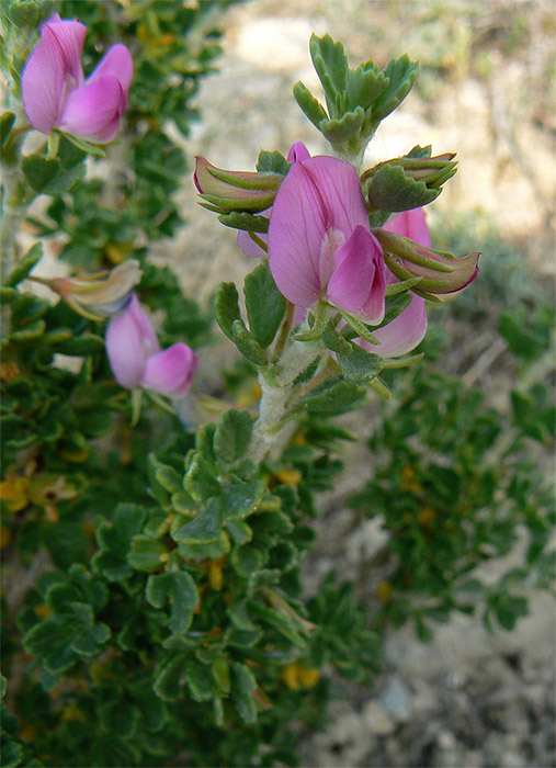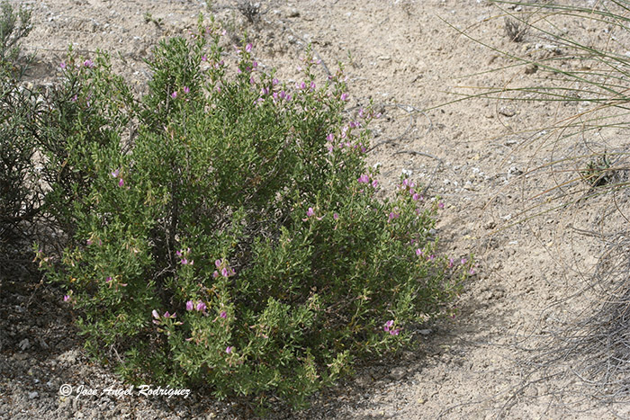 También conocido con los nombres populares de asnallo, gatuña y quebraollas (región de Murcia), es un bonito y atractivo arbusto mediterráneo, de hasta 1,5 m, exclusivo de suelos yesosos (gipsícola) en la Península Ibérica, considerándose como un óptimo indicador de la presencia de yesos, resistente a la salinidad y muy valorado ecológicamente.