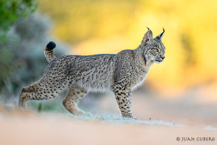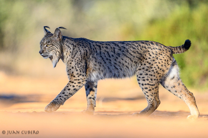 El lince ibérico (Lynx pardinus), es una emblemática especie de la fauna ibérica, de la que es endémica, de forma que solo puede encontrarse en España y Portugal, ha sido descrito como un felino de tamaño medio, con una masa corporal en torno a los 12,8 kg en los machos y 9,3 kg en las hembras, con la capa de su pelaje moteada, y adaptada al mimetismo entre la vegetación en que se mueve, que cuenta con una característica cola corta, de tan solo 8 a 15 cm., y unas orejas grandes y erguidas, también muy identificativas de la especie, que también aparecen dotadas de unos característicos pinceles de pelo negro, con la cara rodeada por pelos muy largos, formado unas grandes patillas terminadas en punta, que se desarrollan más con la edad del individuo.