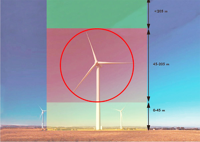 Por lo que dejando claro que nuestra asociación, Proyecto Sierra de Baza, no está en contra, sino todo lo contrario, de los usos e implantación de las energías renovables, las que se caracterizan por funcionar con fuentes de energía que poseen la capacidad de regenerarse por sí mismas y, como tales, ser teóricamente inagotables, si se utilizan de forma sostenible, por lo que estamos a favor de la sustitución de las energías fósiles por energías alternativas no contaminantes como las fotovoltaicas o las eólicas, que son claramente beneficiosas para la reducción de la emisión de los gases de efecto invernadero, lo que está unánimemente admitido como inductores del cambio climático, sin embargo ello no puede ser un cheque en blanco para el establecimiento de actividades de este tipo en territorios sensibles y con altos valores ecológicos y medioambientales a proteger, como son los pretendidos para la implantación de estos parques eólicos, encontrando muy cuestionable y contraproducente la idoneidad de la ubicación de la actividad pretendida, que no solo supone una grave y manifiesta afección paisajística, sin prever soluciones paliativas efectivas, ya que por la magnitud de los aerogeneradores que se quieren instalar, con un rotor de 170 metros de diámetro y una altura total de 215 metros, al sumarle la separación de las palas del suelo (45 metros), tal y como se reproduce de forma gráfica en la siguiente figura, tomada de la pág. 33 del ANEXO III AL ESTUDIO DE IMPACTO AMBIENTAL (RIESGO PARA LA FAUNA VOLADORA) que se presenta de forma conjunta para estos y otros parques eólicos de la zona:
