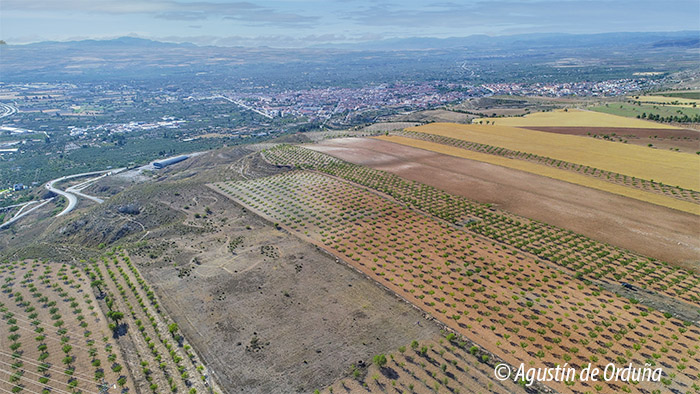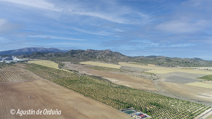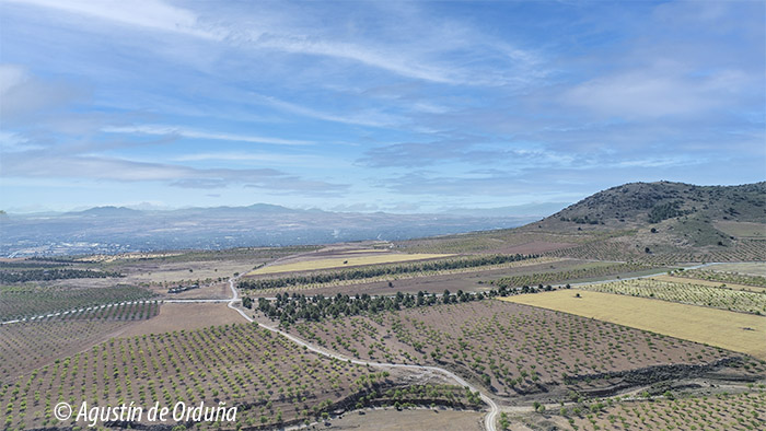 Estepa cerealística, en una de las zonas en la que quiere implantarse el parque eólico de los Llanos de Cuquillo, con la ZEC Sierra de Baza Norte al fondo. El interés de la fauna de invertebrados presente en toda esta zona es muy alto.