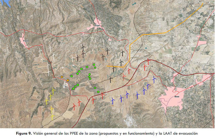 La siguiente imagen, tomada de la cartografía del Parque Eólico Llanos del Cuquillo, permite comprobar como los aerogeneradores previstos al norte de la ZEC rompen al conectividad del Parque Natural Sierra de Baza con la ZEC Sierra de Baza Norte y con la Depresión de Guadix-Baza de Norte a Sur, y viceversa que es la habitual ruta seguida por las aves migratorias para moverse entre Europa y África en nuestra zona, dada la densidad de aerogeneradores proyectados en este territorio: