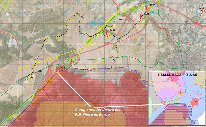Ubicación pretendida de los aerogeneradores del Parque Eólico Llanos de Sabroja, en las proximidades de la Zona de Especial Conservación Sierra de Baza Norte, que queda al sur, rompiendo la conectividad del territorio con la Depresión de Baza y el Parque Natural Sierra de Baza Código ES6140001). A destacar como uno de los aerogeneradores proyectados queda dentro del territorio del Parque Natural Sierra de Baza, un espacio protegido que además está incluido en la Red Natura-2000
