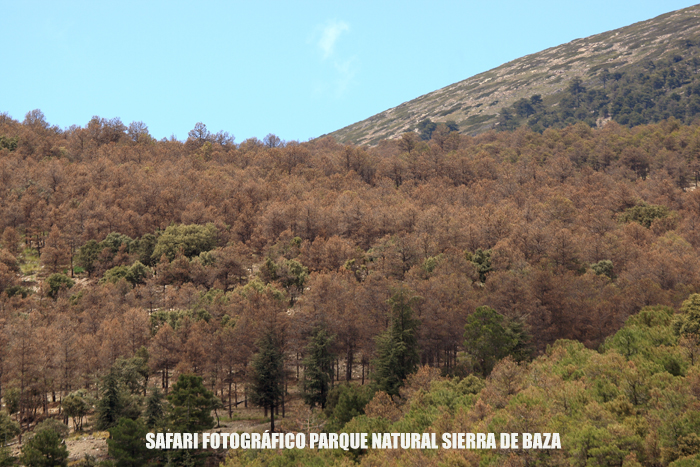 El “Arroyo Bodurria”, ha sido el terma central y obligado de la última edición 2016. En la imagen masa de pinos gravemente afectados por la oruga de la procesionaria en el paraje del arroyo Bodurria, en el que se incluyó como objetivo de caza la incidencia de las plagas de procesionaria y/o muérdago en los pinares de la Sierra de Baza. Fotografía tomada el 14/05/2016, en los días previos al último Safari Fotográfico.